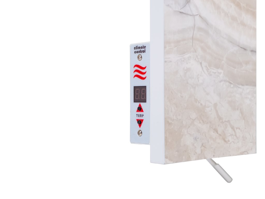 Keramický topný panel s integrovaným digitálním termostatem s možností regulace jak teploty samotného panelu, tak teploty v místnosti.
