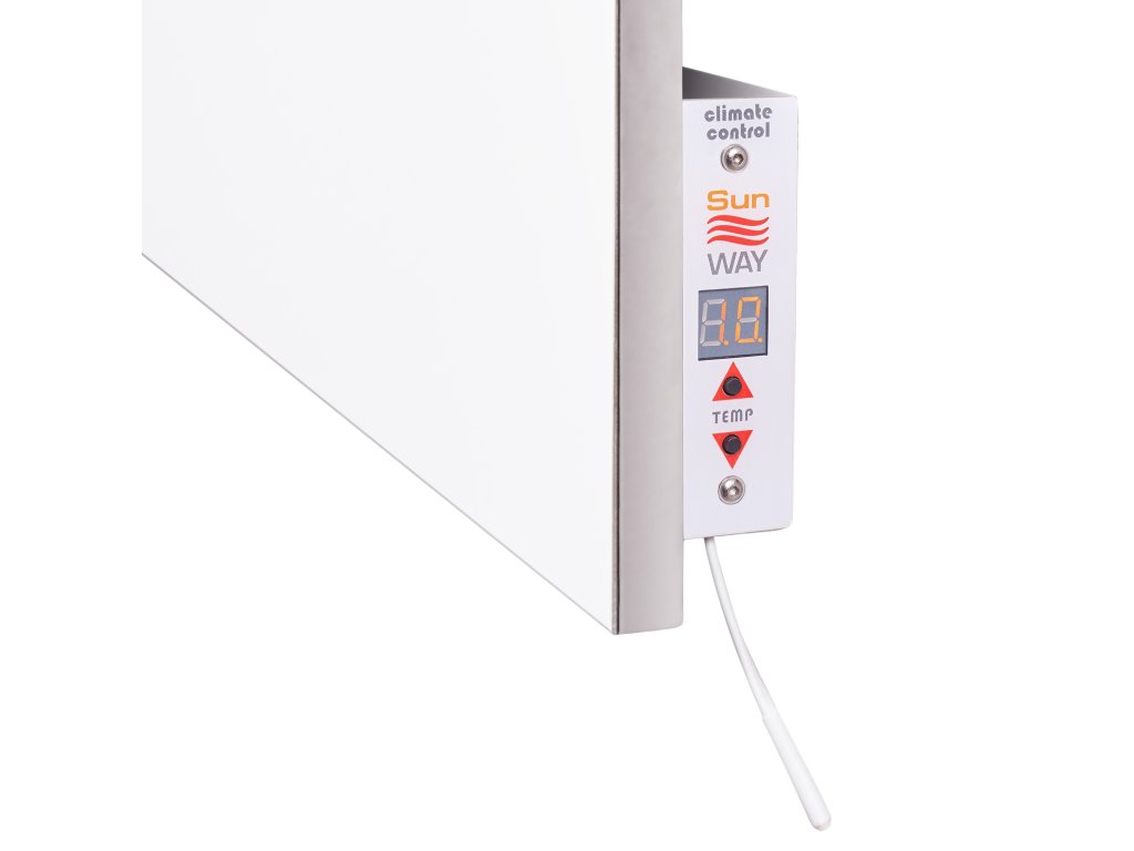 Keramický topný panel s integrovaným digitálním termostatem s možností regulace jak teploty samotného panelu, tak teploty v místnosti.